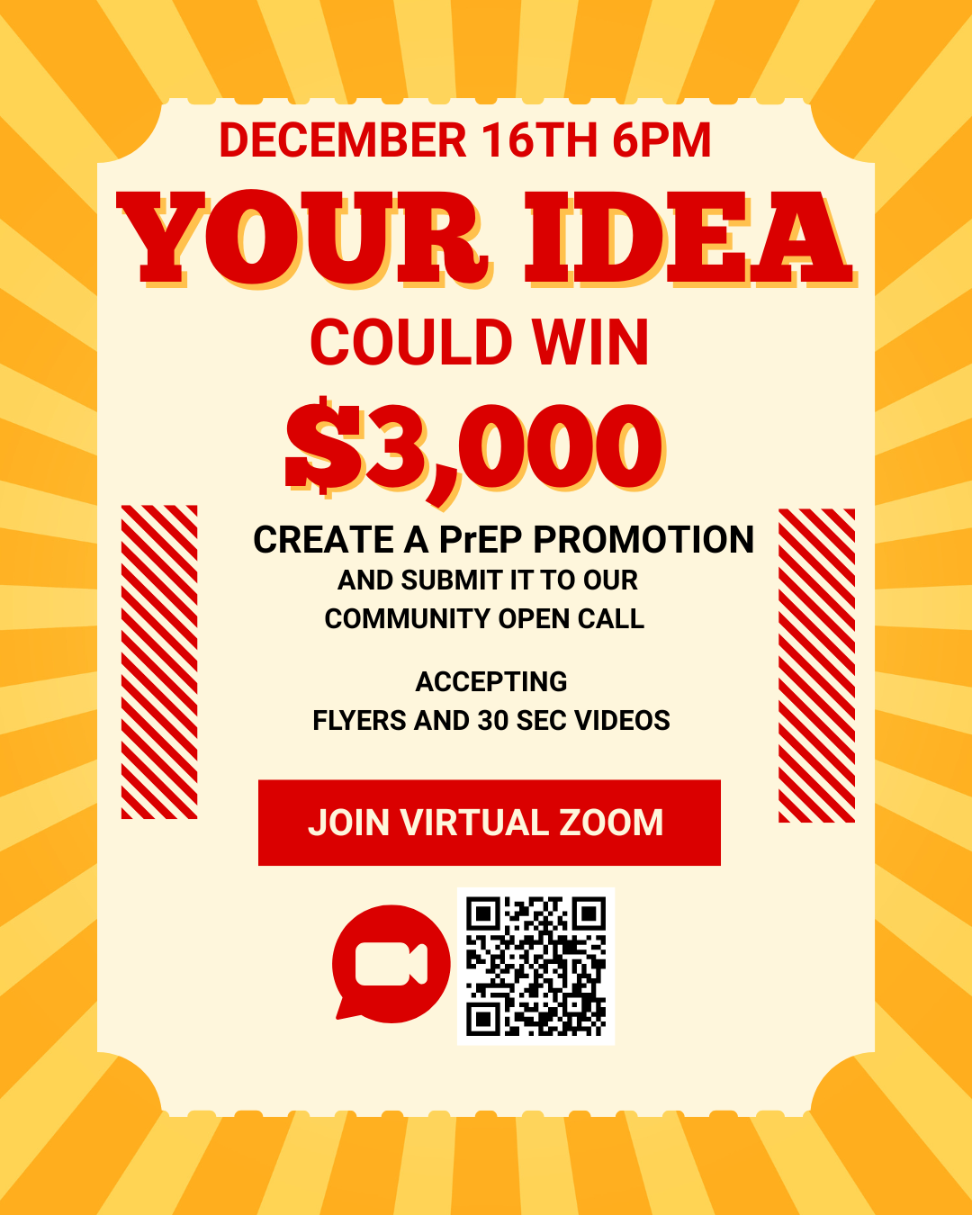 Amplifying Our Voice is hosting a community Open Call to create fresh, relatable PREP promotions. We’re asking community members to submit original content graphics, flyers, images, or short videos (30 seconds or less) that encourage someone in their community to use PREP.